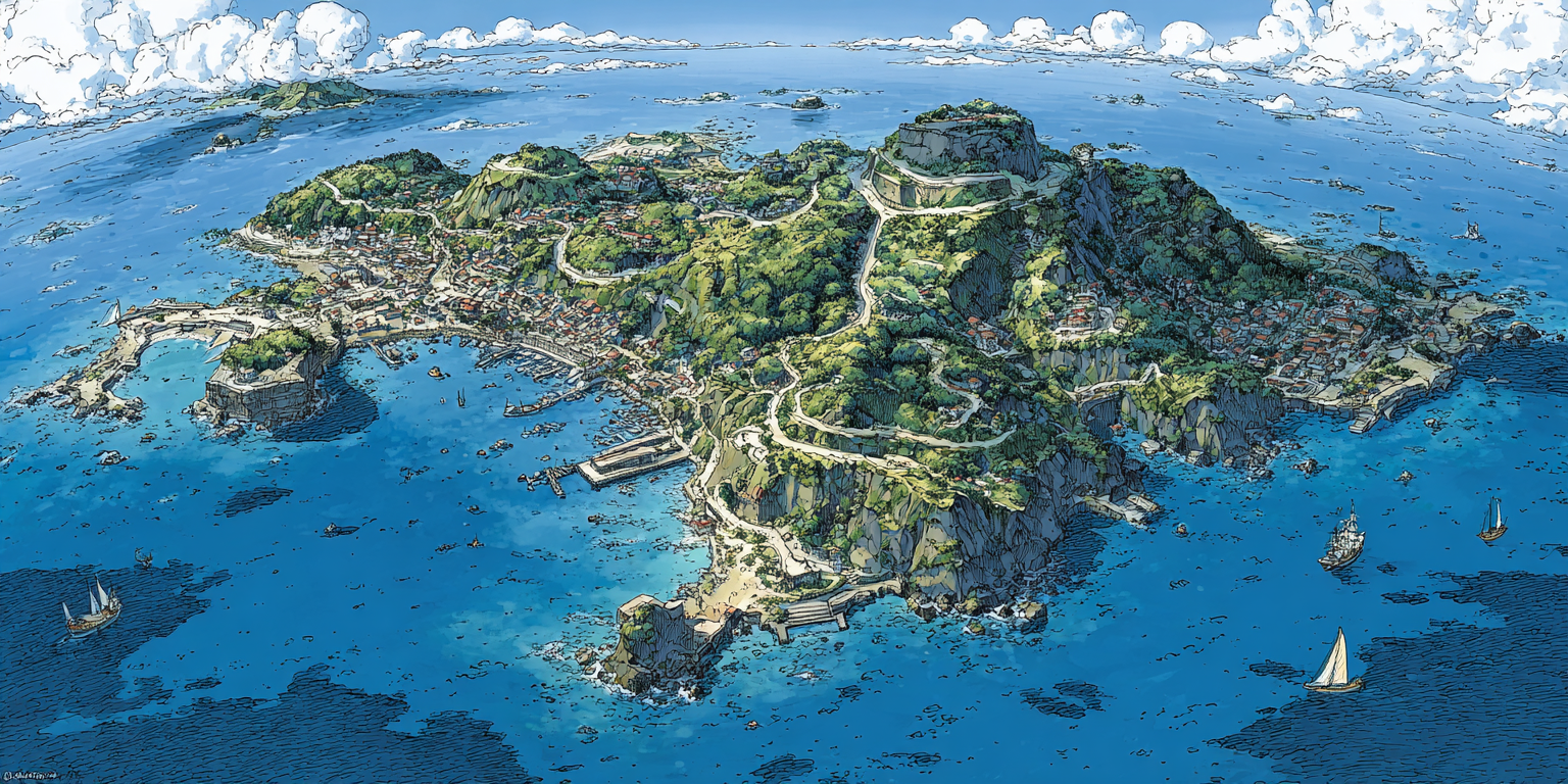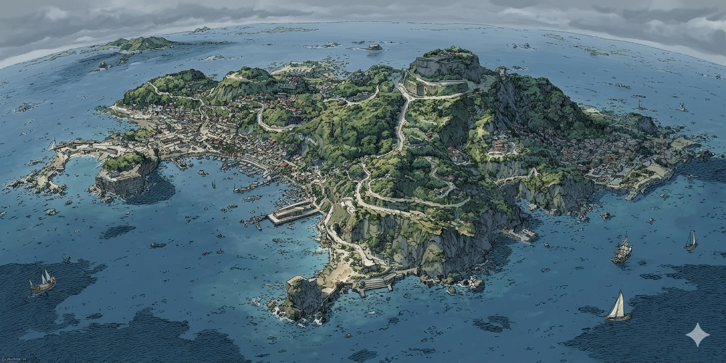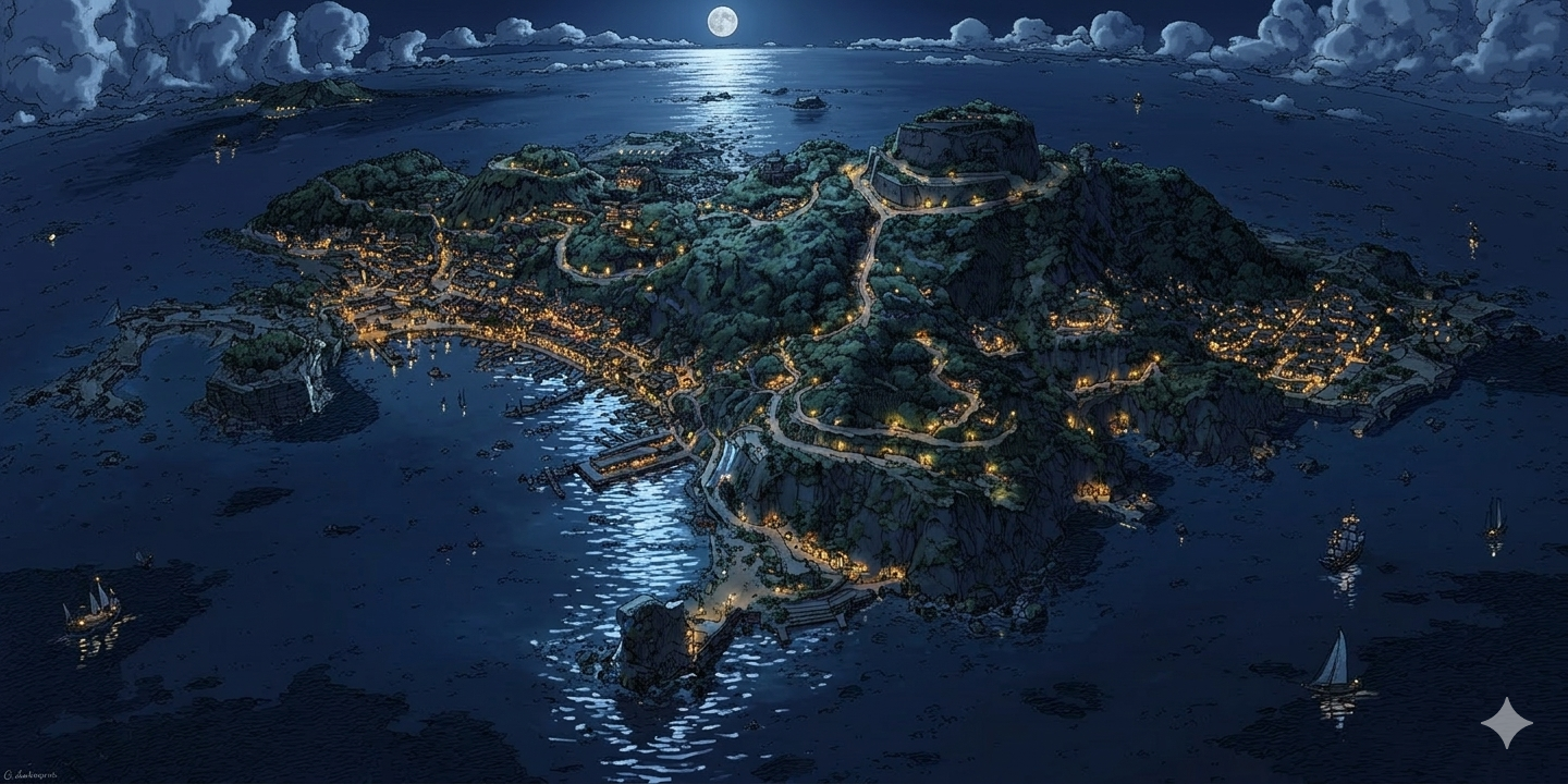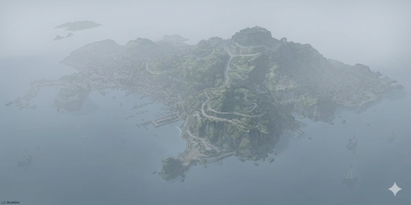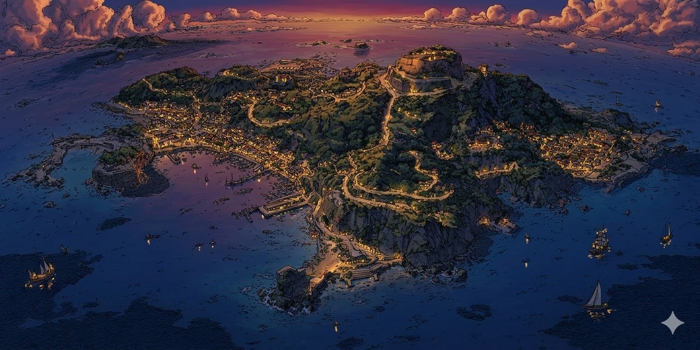 So I tried something. I generated one hero image of the island in Midjourney — a detailed colonial-era bird's-eye view, ships scattered in the harbor, torchlight on the fortress walls. Then I fed it into Nano Banana with a single instruction: change the time of day to twilight. Then sunrise. Then golden hour. Then midday. Then rain. Then fog.