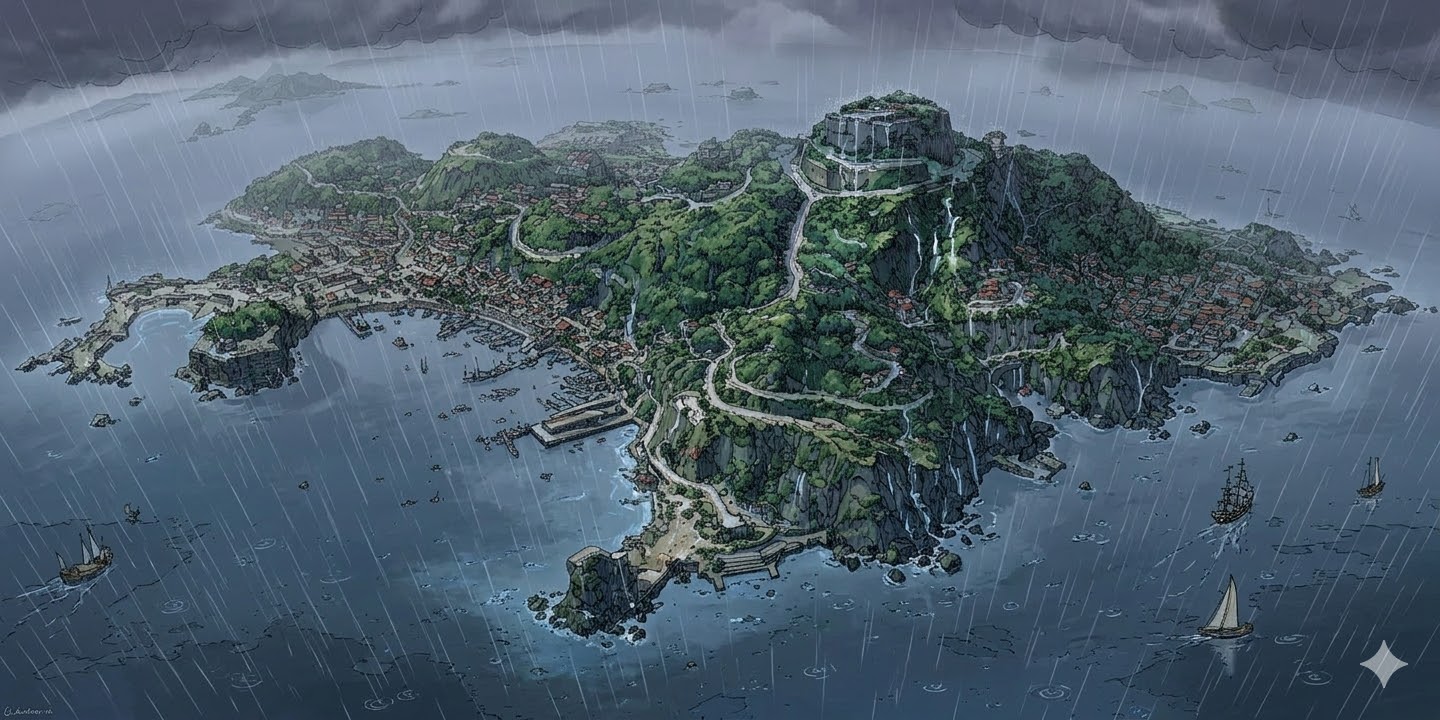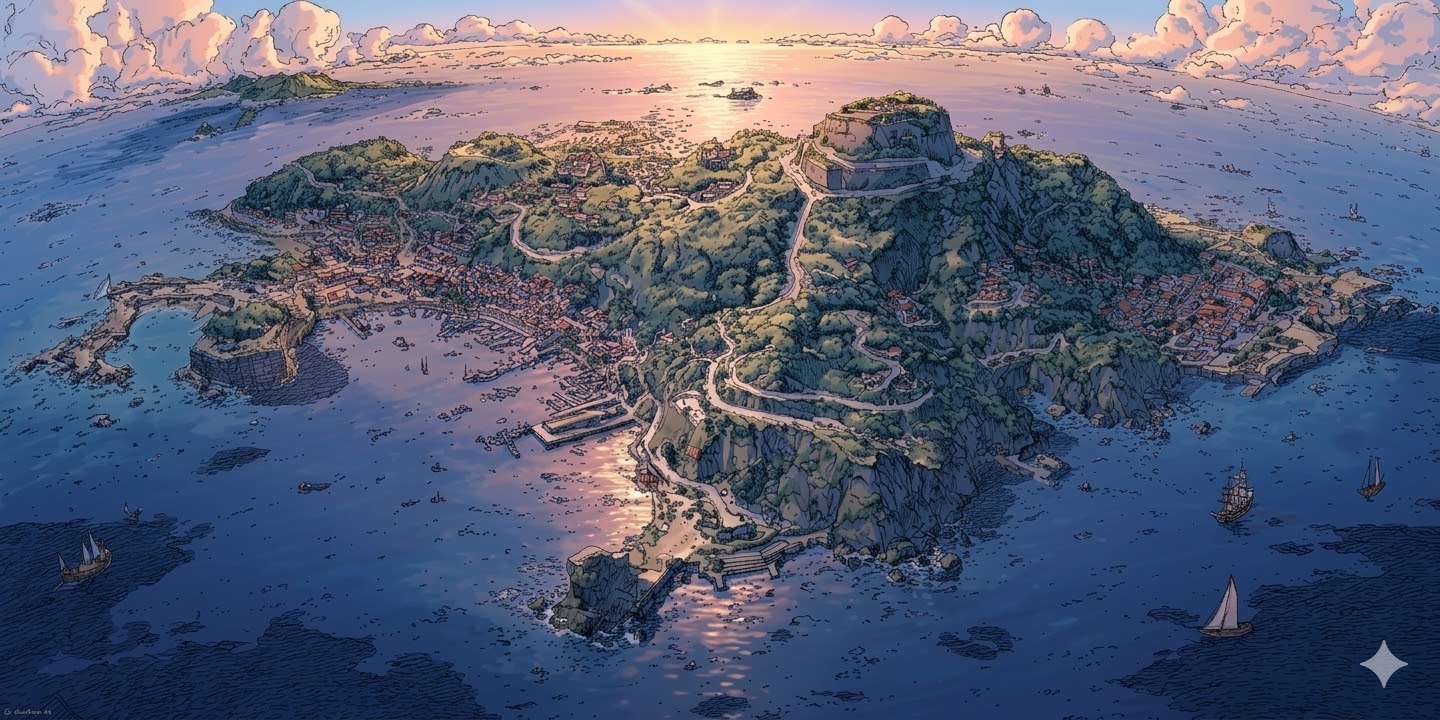 What came back were the exact same island across wildly different skies — geographically consistent, architecturally faithful, just transformed by weather and light. The harbor looks ominous under fog. The fortress glows differently at each hour.